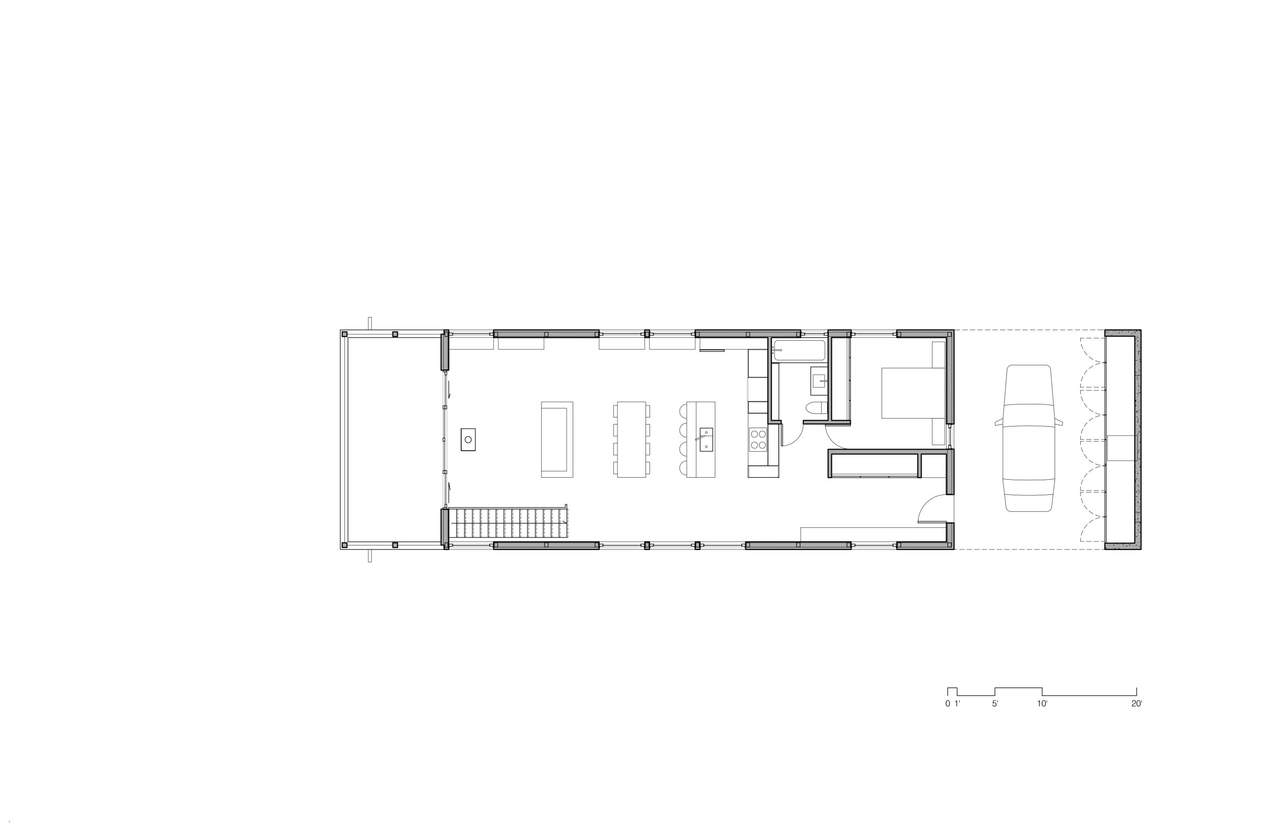 The house is completely covered by cedar planks, stained black on its outdoor walls, and white on the inside faces. The plank siding is displayed horizontally, with a vertical plank corresponding to the position of each of the structural columns inserted in the side walls. Inside, one can see the roof beams supported by these columns which give rhythm to the space.
